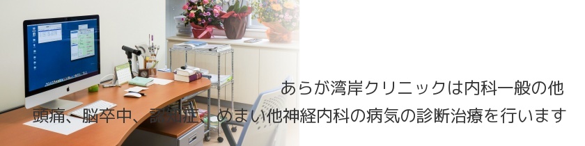 あらが湾岸クリニックは、京都府東舞鶴に平成26年6月に開設しました。日頃から頭痛やめまい、ふるえ、手足のしびれ、物忘れなど健康に関する悩みを抱えておられる方の他、風邪や熱、高血圧、糖尿病、高脂血症など、一般的な内科診療も行います。生活習慣病の治療は、脳梗塞・認知症の予防にも必要です。普段から健康上のことを必要に応じて対応できるかかりつけ医として地域の皆様に安心、信頼、満足を提供するクリニックになれることを理念としております。