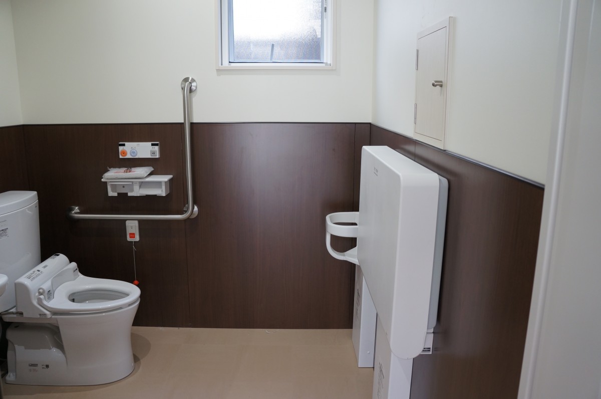 多目的トイレで高齢の方、身障者の方が使いやすい様に、また赤ちゃんのおむつ替えベッドも備え付けてあります。
