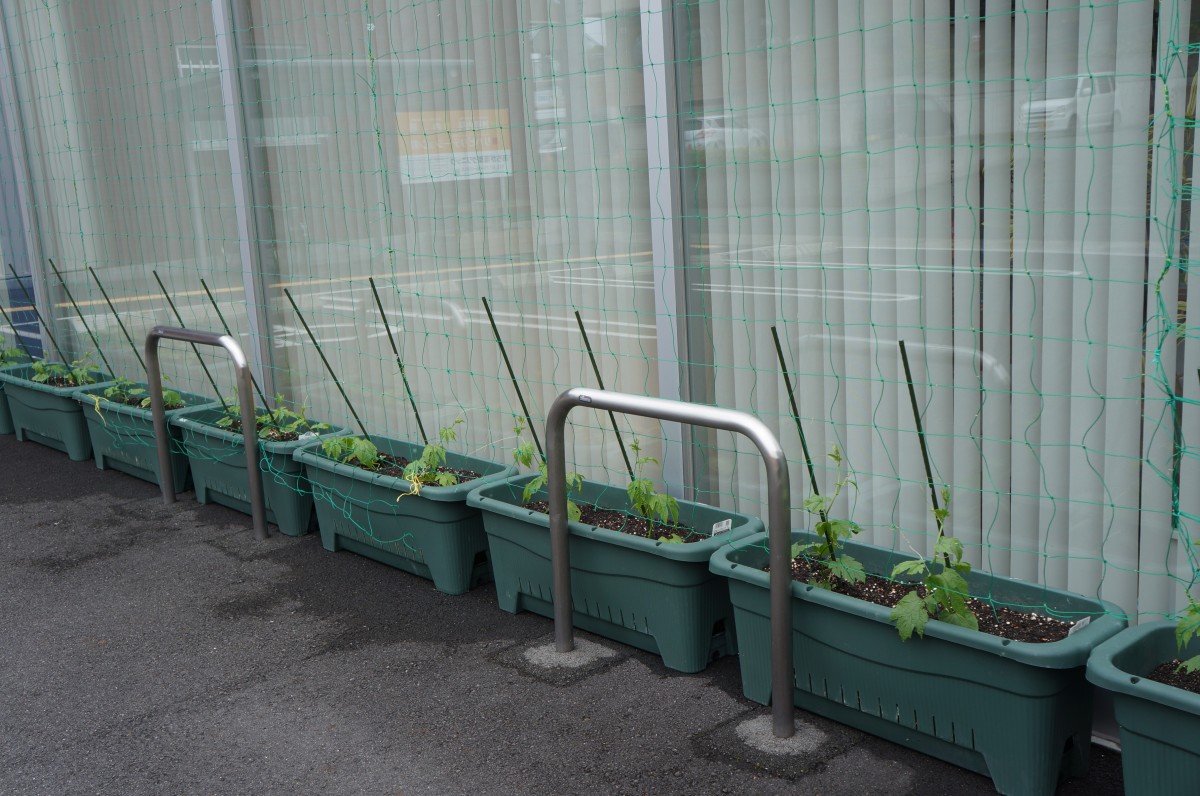 プランターとネットはり、クリニックのグリーンカーテンの準備が整いました。